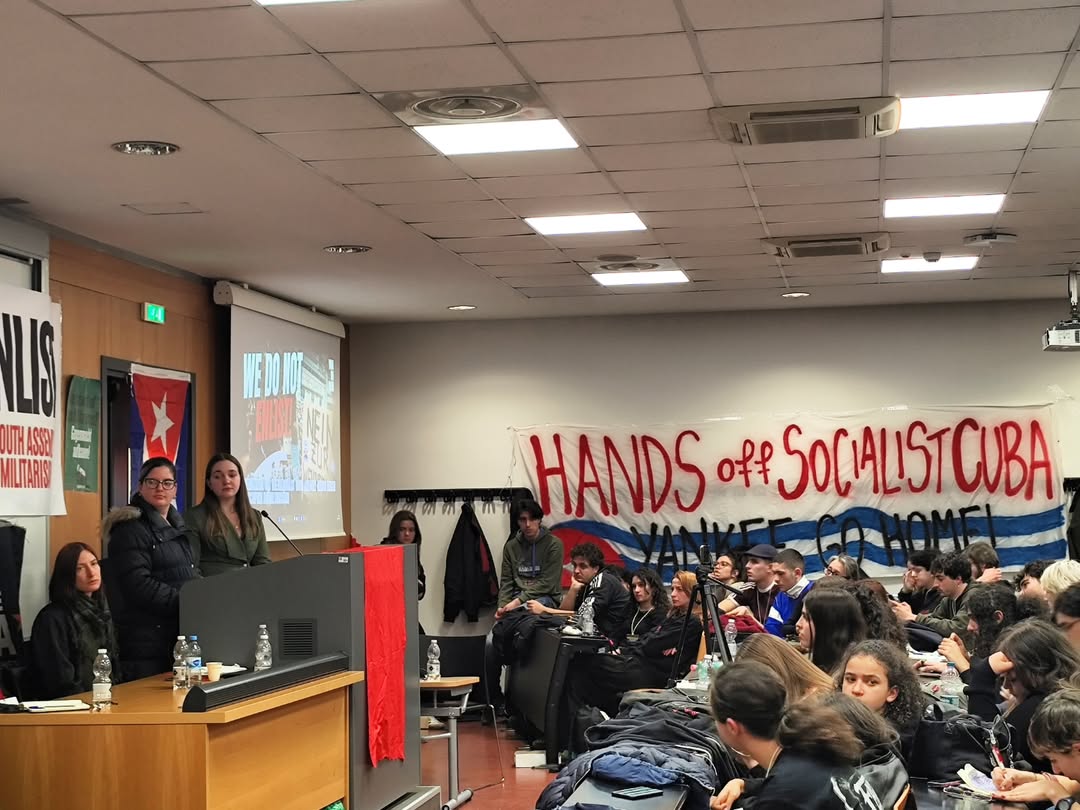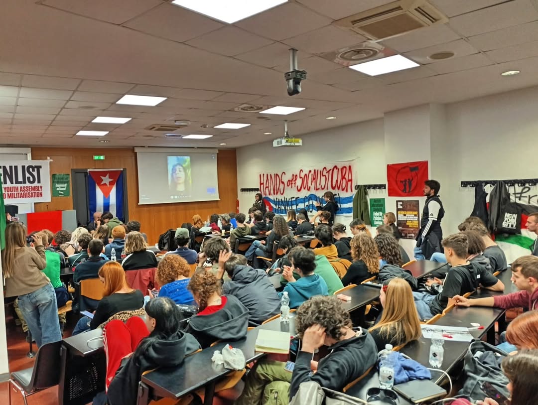 Se siamo qui oggi è in risposta alla tendenza generale alla guerra che si è fatta sentire sempre più forte con l’accelerata imposta negli ultimi mesi dagli Stati Uniti ma anche dai paesi dell’Unione Europea. Al genocidio dei palestinesi, in cui i paesi occidentali non sono solo complici bensì attivamente partecipi e di cui sono pienamente responsabili, si sono aggiunti in rapida successione l’attacco militare degli USA al Venezuela bolivariano e il rapimento del legittimo presidente Nicolas Maduro Moros e della prima combattente Cilia Flores, la guerra criminale di aggressione scatenata il 28 febbraio contro Iran e Libano da Stati Uniti e Israele e l’assedio di Cuba socialista, a cui oggi gli Stati Uniti stanno negando ogni scambio con l’esterno, impedendo l’ingresso di carburante e medicine. Il popolo cubano, di fronte a questo crimine contro l’umanità, sta resistendo con forza. Oggi stesso all’Avana ci sarà una manifestazione di popolo contro l’aggressione statunitense, come se ne sono susseguite molte negli ultimi mesi. Oggi è anche una giornata importante per la solidarietà internazionale con Cuba, essendo il giorno di arrivo del Nuestra America Convoy e della Nuestra America Flotilla, a cui partecipiamo. Per questo vorrei dedicare questa assemblea a Cuba e alla Rivoluzione Cubana che resiste.