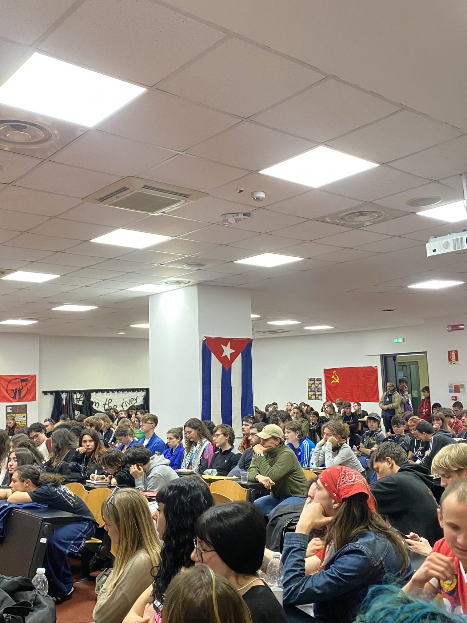 L’assemblea vera e propria si è tenuta sabato nelle aule dell’università Bicocca, strutturata in due sessioni intervallate dal pranzo. L’intervento introduttivo di Cambiare Rotta, qui riportato per intero, ha proposto di continuare a organizzare i giovani contro la leva, il riarmo e la militarizzazione costituendo una campagna internazionale “Noi non ci arruoliamo!” e ha presentato la data dell’8 maggio come momento di mobilitazione comune, una data simbolica per rappresentare l’opposizione della gioventù europea al ripresentarsi di una prospettiva di guerra e il rifiuto di andare a combattere per alleanze genocide, guerrafondaie e imperialiste come l’Unione Europea e la NATO. Un passaggio mobilitativo di questo tipo è necessario per costituire davvero una campagna di lotta internazionale e non limitarsi a un forum in cui scambiare analisi sulle criticità del riarmo europeo, ma soprattutto una mobilitazione internazionale è un attacco forte diretto all’UE che può effettivamente metterla in difficoltà nel portare avanti politiche comunitarie belliciste. La data dell’8 maggio è poi simbolica in quanto 81esimo anniversario della resa della Germania nazista e della fine della Seconda Guerra Mondiale nell’Europa liberata anzitutto dall’Armata Rossa.