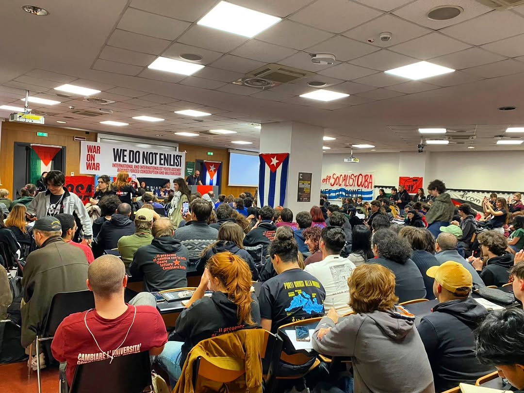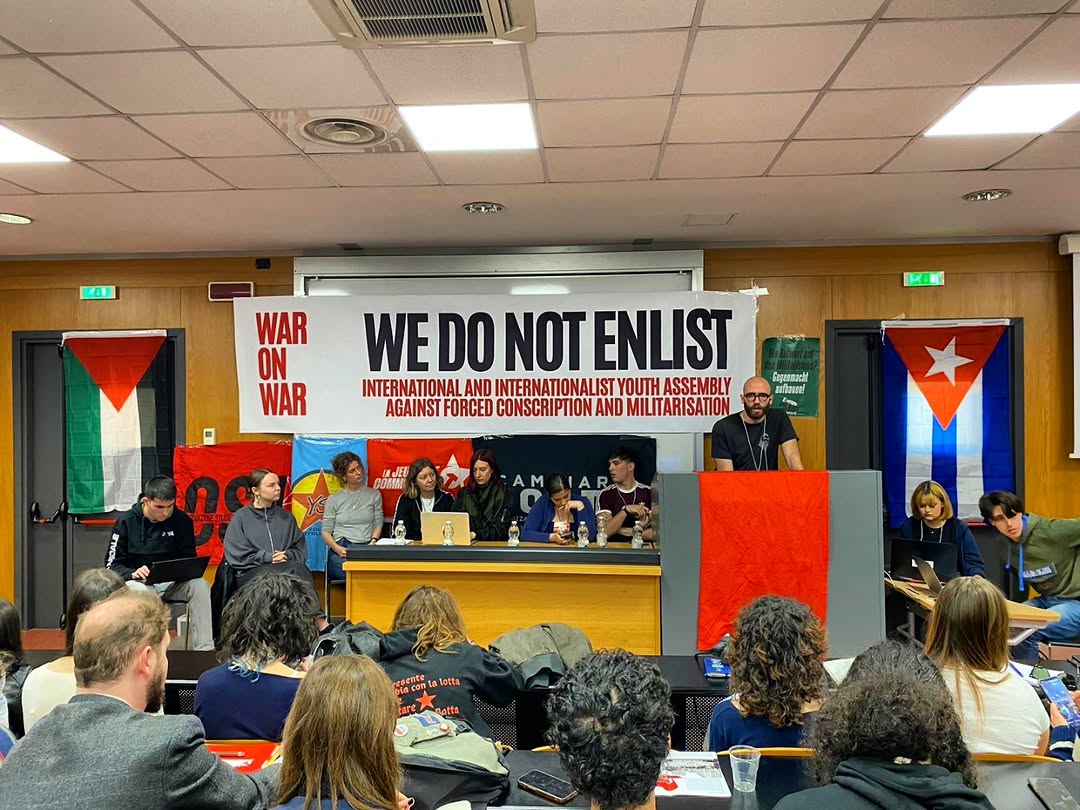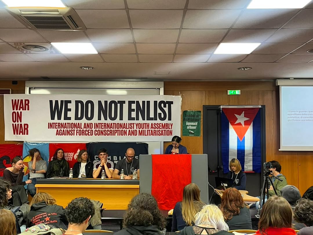 La sessione pomeridiana è stata fittissima, con la partecipazione dell’Unione Sindacale di Base, di Potere al Popolo e dell’Osservatorio contro la militarizzazione di scuole e università, oltre alla Gioventù Comunista Svizzera, ai giovani tedeschi di Freie Deutsche Jugend, Internationale Jugend, Pride Rebellion e Schule gegen Krieg e al Collettivo Autorganizzato Universitario di Torino. I partecipanti hanno portato il proprio contributo, tradotto in inglese e in italiano, mettendo in comune ragionamenti ed esperienze per dotare il movimento internazionale degli strumenti per combattere la leva militare, il riarmo, l’Unione Europea e la NATO. Al termine dell’assemblea è stata redatta una dichiarazione congiunta, riportata per intero in fondo alla pagina, che stabilisce gli obiettivi della campagna “Noi non ci arruoliamo!” e la piattaforma rivendicativa della mobilitazione internazionale dell’8 maggio: lotta alla leva, al riarmo e all’esercito europeo, per l’uscita dalla NATO e da qualunque guerra e la fine della complicità con Israele, promuovendo invece la solidarietà internazionalista con Cuba e con tutti i popoli del mondo sotto attacco dall’imperialismo occidentale.