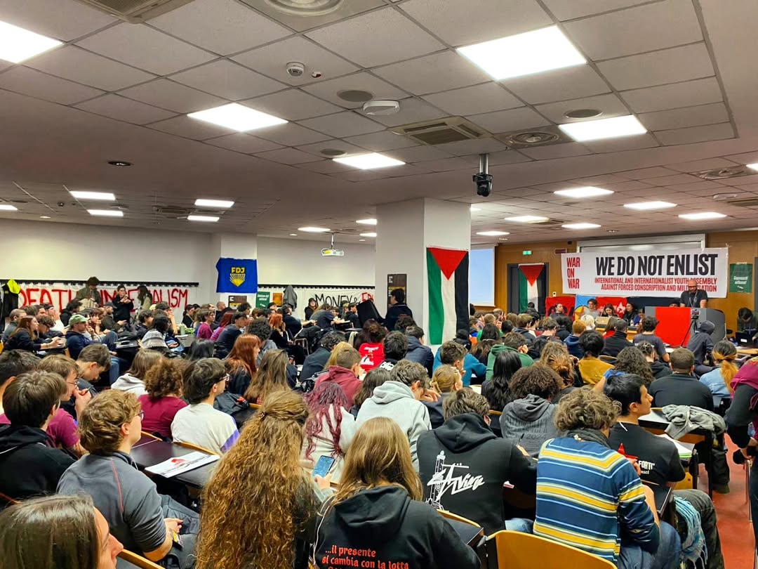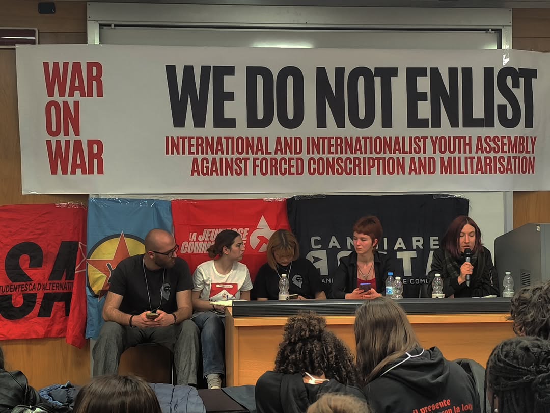 Ma i giovani hanno dato un netto segnale di rifiuto. Le oceaniche mobilitazioni internazionaliste al fianco della Palestina hanno mostrato chiaramente che i popoli e i giovani non credono più ciecamente alla propaganda dei nostri governi occidentali, che si riconoscono nella lotta di liberazione nazionale e sono più che pronti a mettersi in gioco con spirito internazionalista. Sono state un passaggio fondamentale in cui i giovani di tutto il mondo hanno lottato per una causa comune, per la solidarietà fra i popoli e contro l’imperialismo di Stati Uniti e Israele. Un nuovo segnale è arrivato dagli scioperi studenteschi di massa contro la leva militare in Germania. I giovani in guerra non ci vogliono andare. Noi non ci arruoliamo, rifiutiamo la guerra e saremo sempre al fianco di quei popoli che subiscono gli attacchi dell’imperialismo nel tentativo di forgiare il proprio futuro. È giunto il momento di organizzarci a livello internazionale per dare una degna risposta alle classi dominanti che vogliono portarci in guerra e per affrontare direttamente la NATO e l’Unione Europea. Per questo siamo qui oggi in quest’assemblea così piena e per questo è necessario costruire un percorso duraturo di confronto e di collaborazione anche pratica tra giovani in tutta Europa. “Noi non ci arruoliamo” è il titolo di quest’assemblea me deve essere lo slogan della gioventù che rifiuta la guerra e di un percorso di mobilitazione congiunta e coordinata a livello internazionale, da costruire attraverso un continuo confronto aperto fra organizzazioni, sull’analisi e sugli obiettivi da perseguire. Dobbiamo metterci in condizione come giovani europei di affrontare i tentativi di reintroduzione della leva militare e tutte le sfide che l’oggettività ci presenterà. Il prossimo 8 maggio, nell’anniversario della fine della Seconda Guerra Mondiale, scendiamo in piazza in tutta Europa per gridare che non vogliamo essere nuovamente trascinati in guerra, ancora una volta da una coalizione genocida e ancora una volta per gli interessi del grande capitale europeo e occidentale. Celebriamo la vittoria della guerra da parte della gloriosa Armata Rossa, dei partigiani e dei paesi alleati, rifiutiamo i tentativi di cancellare quella data da parte dell’Unione Europea e anzi rendiamola viva come il giorno in cui i giovani europei si mobilitano uniti contro la leva, il riarmo e la militarizzazione.